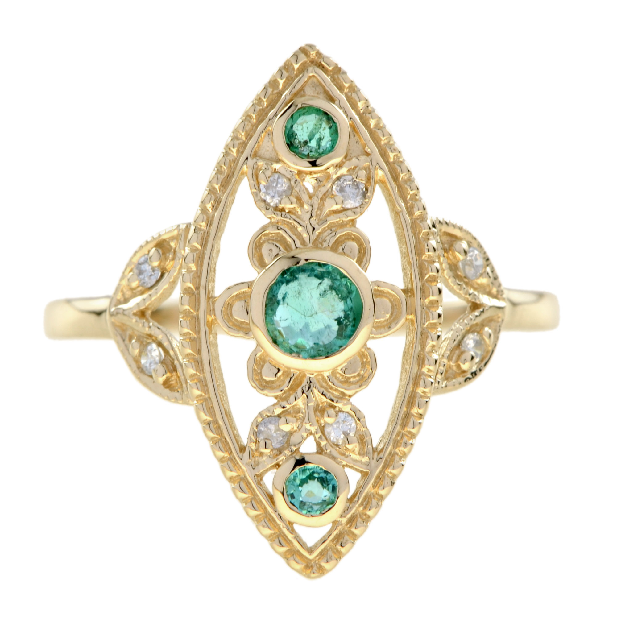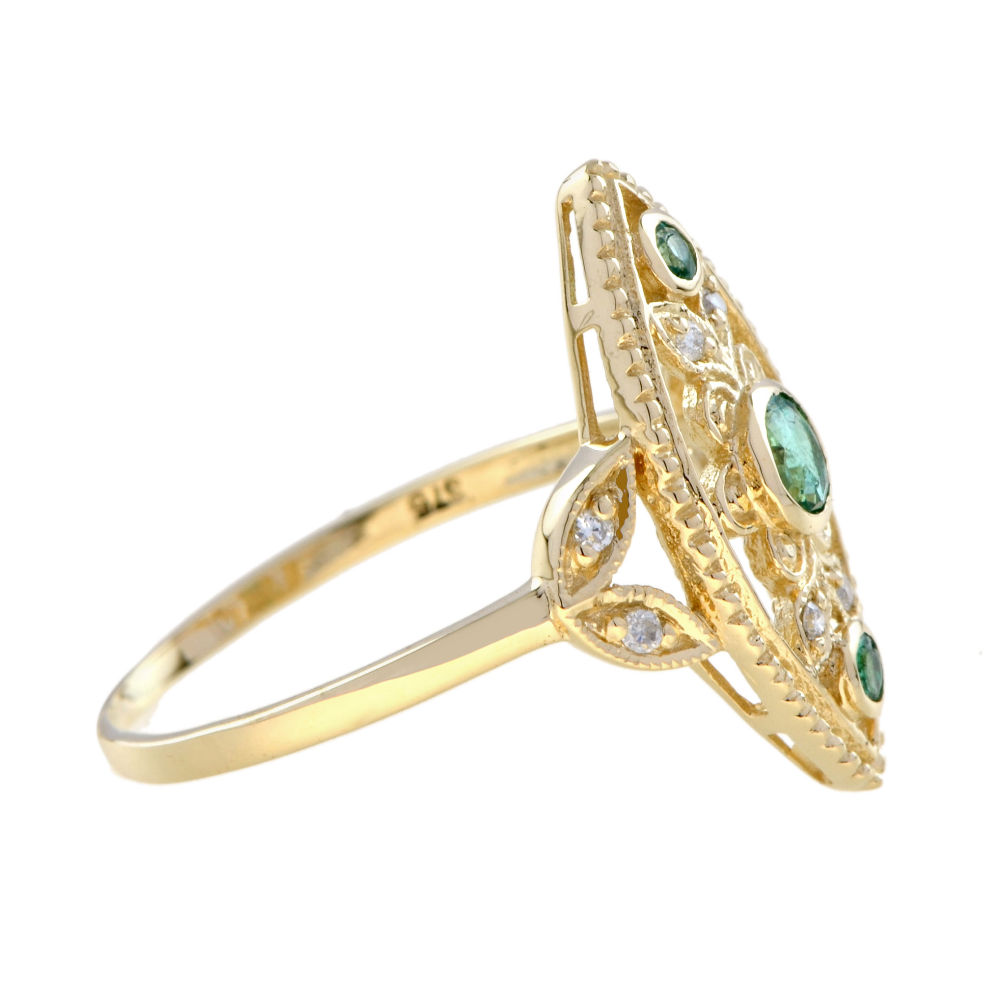 RING 9KY EMERALD EYE, 3 ROUND EMERALD, 8RDI=0.04PTS