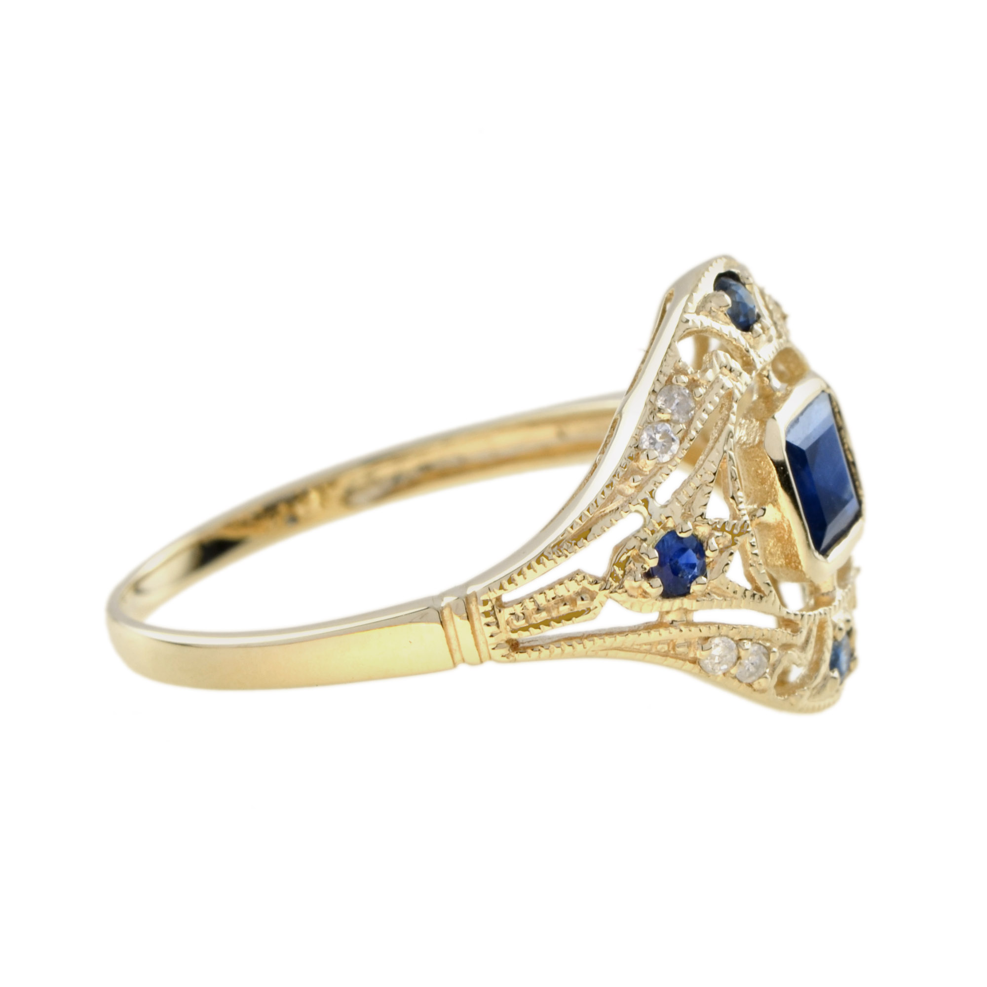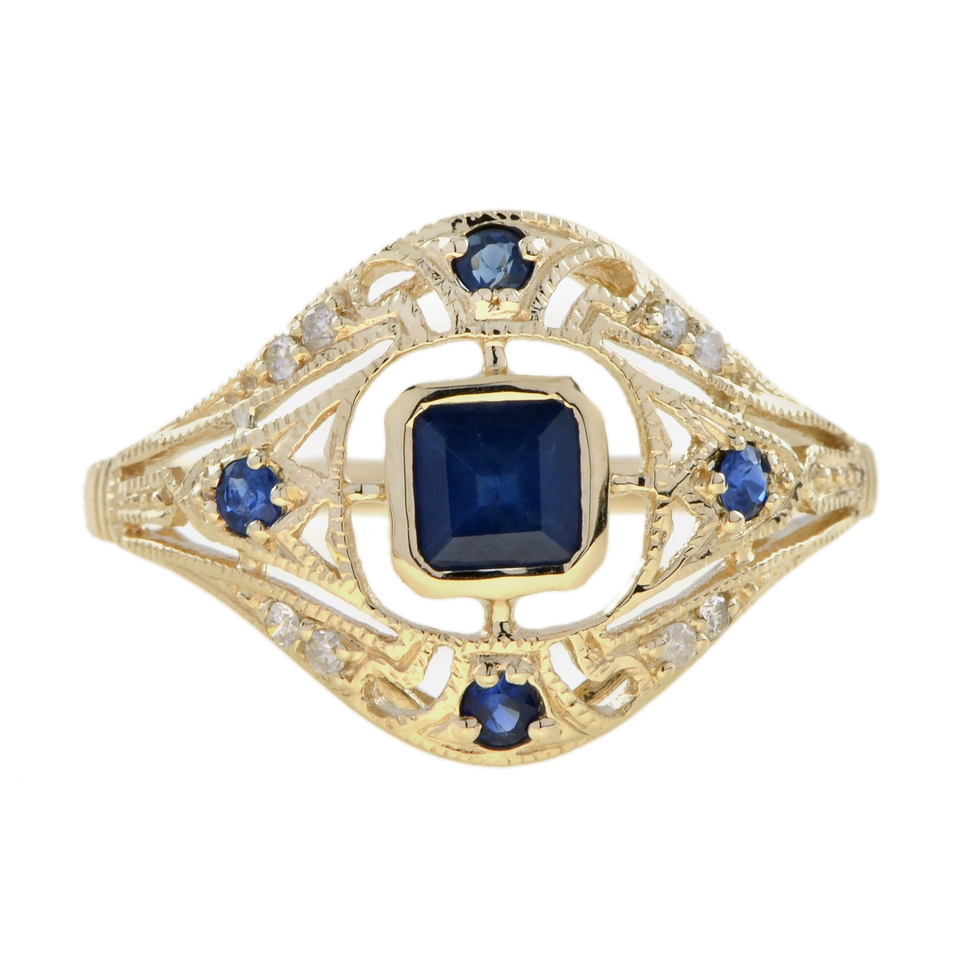 RING 9KY SAPPHIRE WITH DIAMONDS, 1 CUSHION CUT SAPPHIRE + 4 ROUND SAPPHIRE, 8RDI=0.04PTS