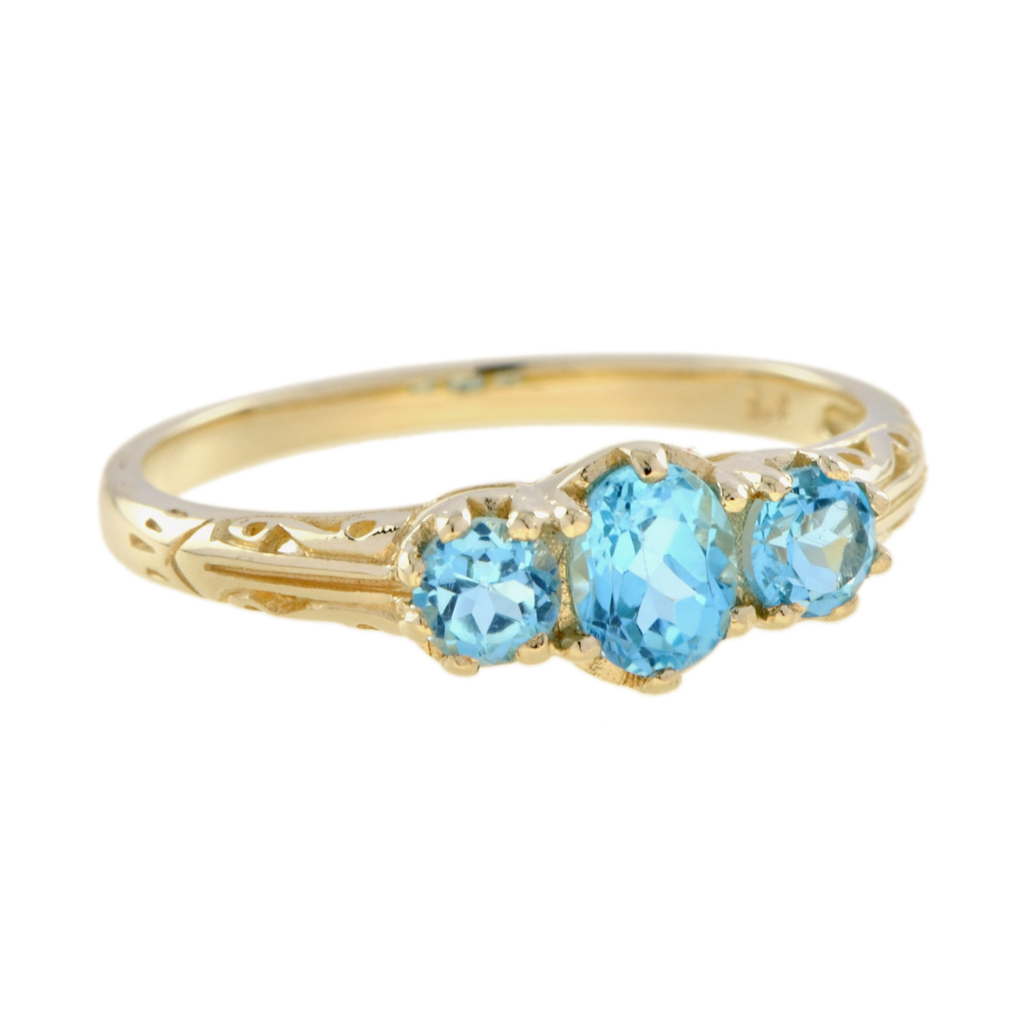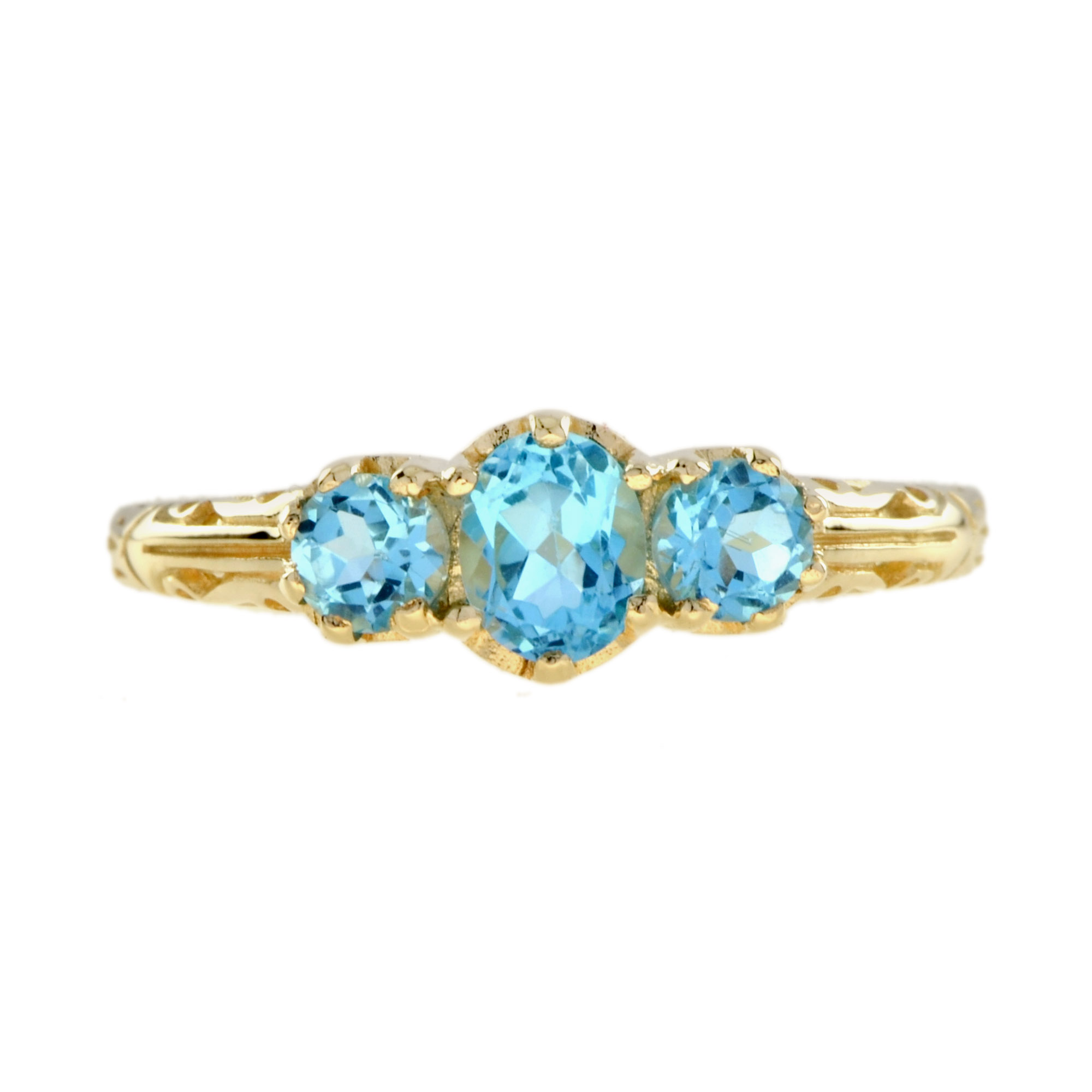RING 9KY SWISS BLUE TOPAZ TRILOGY, OVAL CENTRE STONE WITH 2 ROUND SIDES