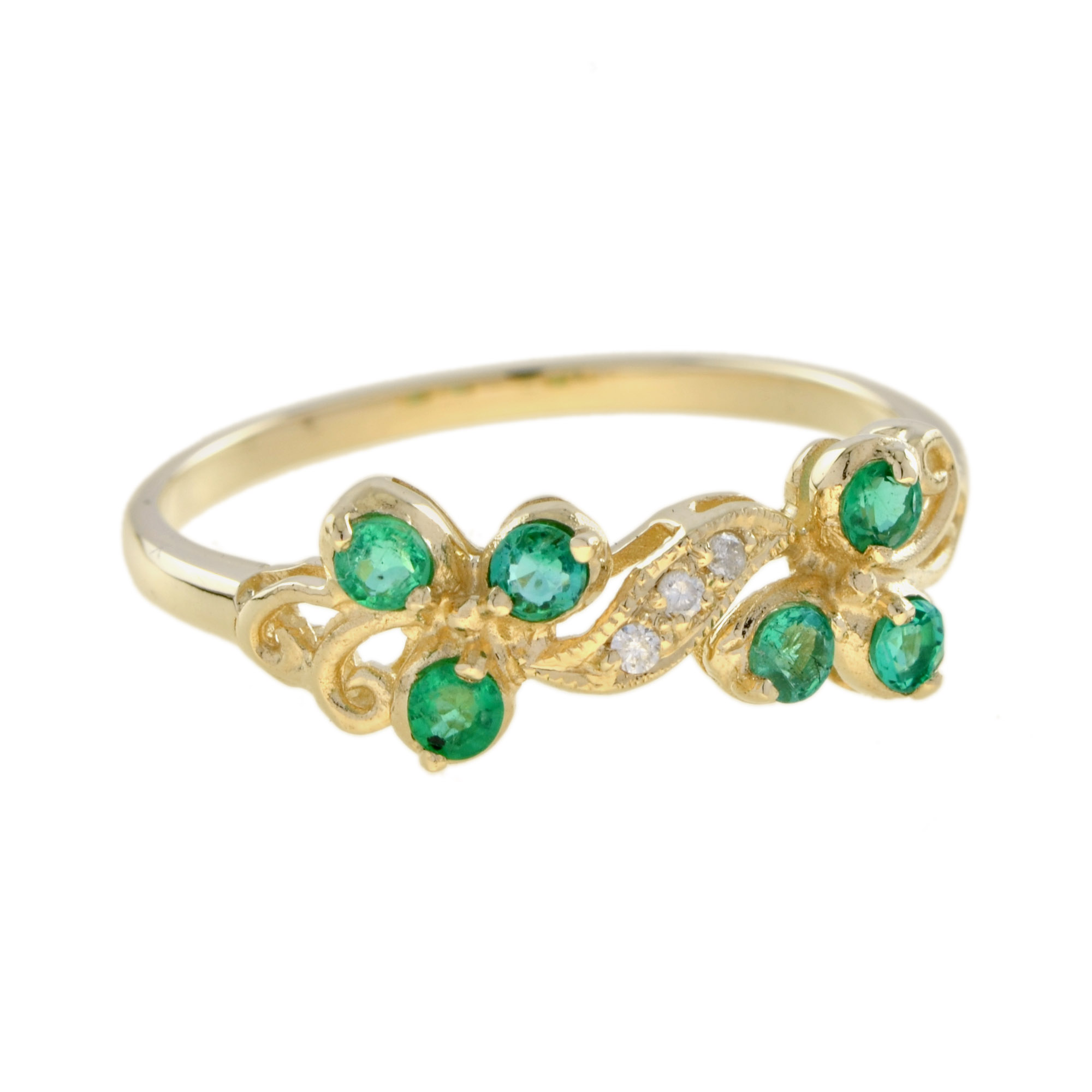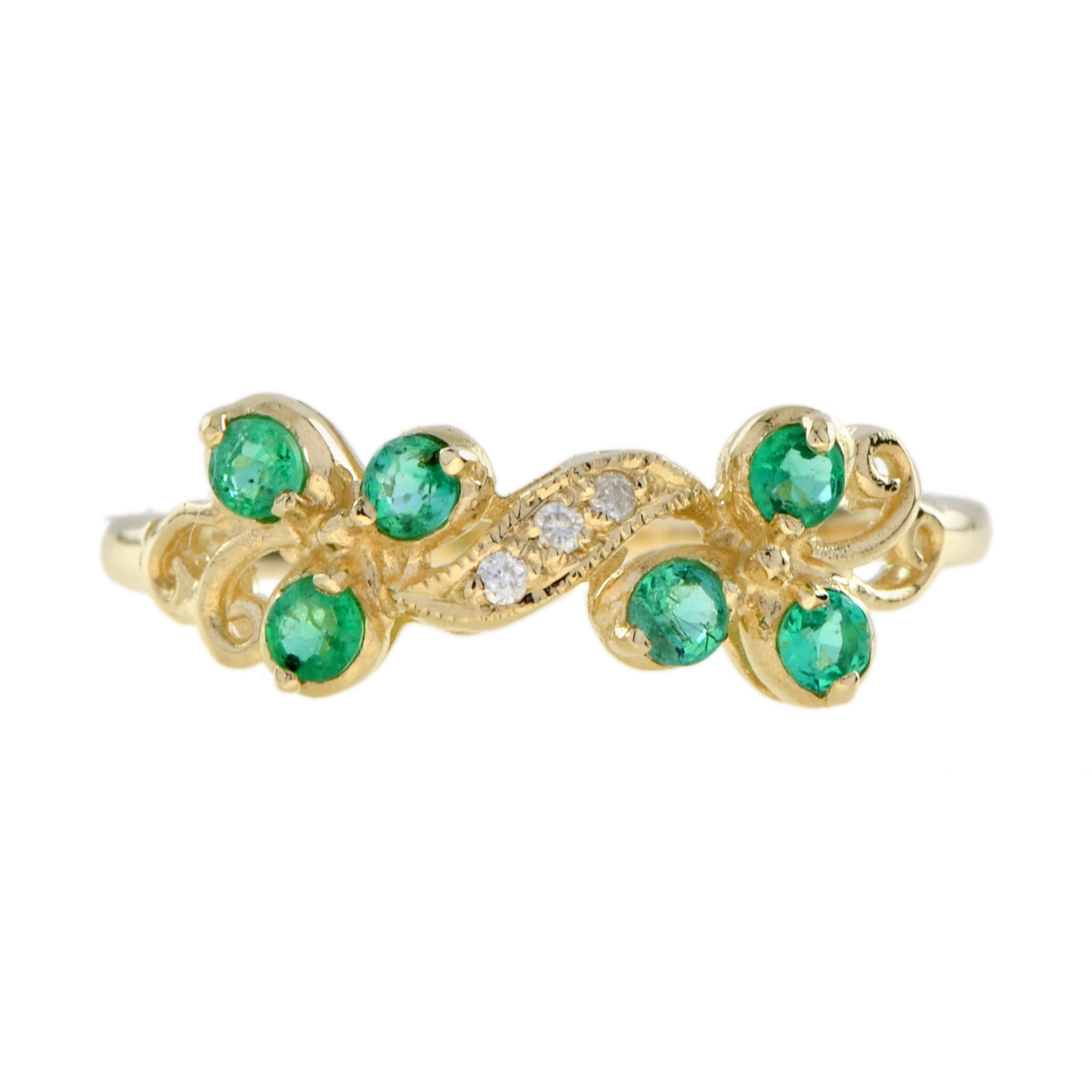 RING 9KY TWIST VINE EMERALD WITH DIAMONDS, 6 ROUND AMYTH, 3RDI=0.015PTS